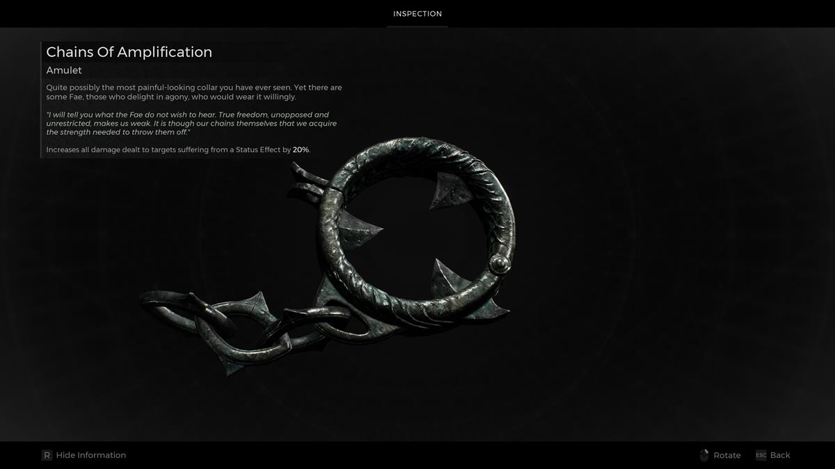 - Amuleto: Cadenas de amplificación – Siento que el Ritualista realmente aprovecha al máximo las Cadenas de amplificación, un amuleto que te hace infligir un 20% más de daño contra enemigos debilitados. Puedes encontrarlo como una entrega aleatoria en la región de Losomn.