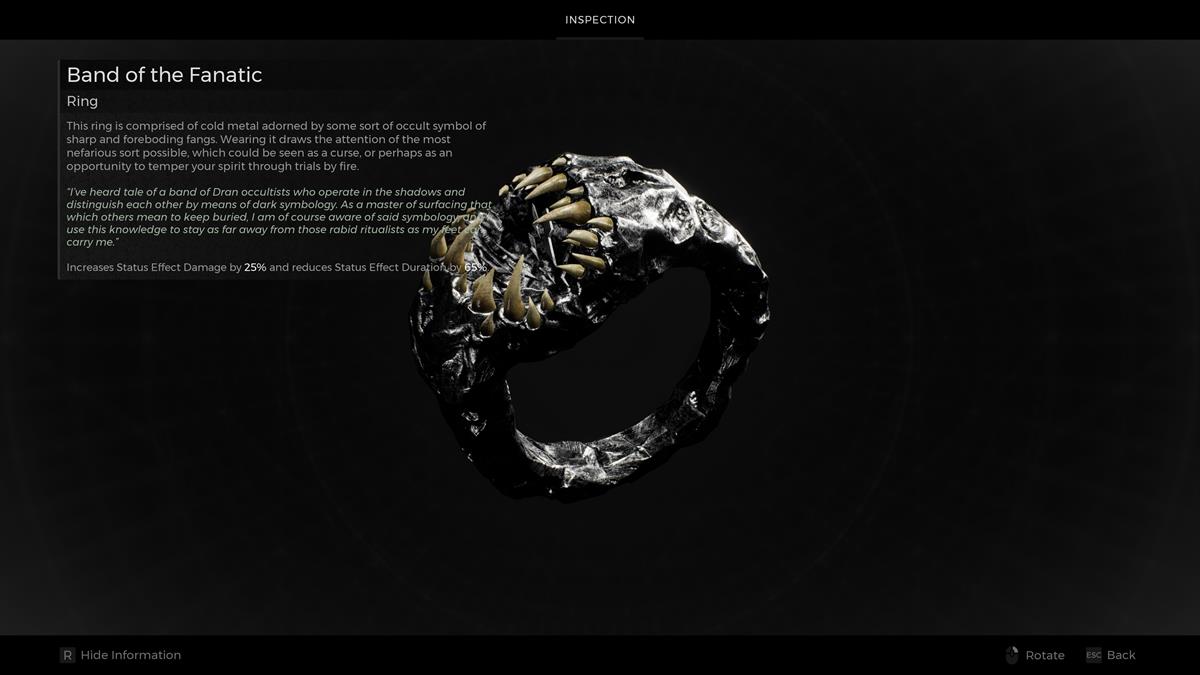 - Anillo #1: Banda del Fanático – Este es uno de los mejores artículos ritualistas en Remanente 2: El Rey Despertado, gracias al daño del efecto de estado aumentado. Para ser justos, disminuye la duración de las aflicciones que causas, pero hay formas de aliviarlas. La clase ya tiene ventajas innatas que aumentan la duración y también hay otro anillo que se puede usar junto con este. En cualquier caso, puedes conocer más sobre este artículo en nuestro Guía Banda del Fanático.