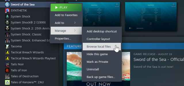- Pentru a remedia acest lucru, urmează pașii de mai jos.Asigură-te că Sword of the Sea nu rulează în prezent. Deschide Steam și navighează la biblioteca ta.Faceți clic dreapta pe Sword of the Sea, apoi pe
