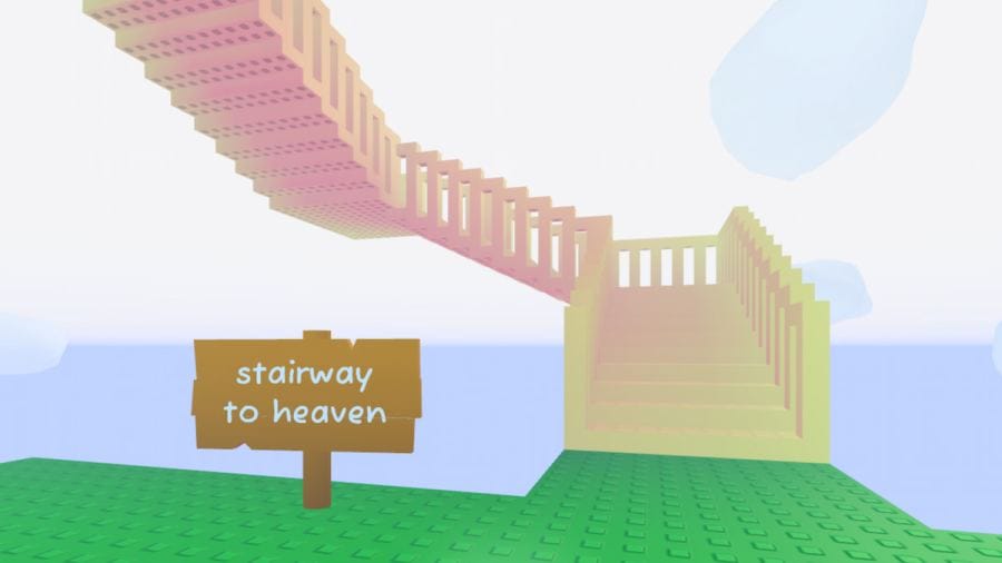 Una vez aquí, todo lo que hay que hacer es ascender la interminable (y literal) Escalera al Cielo. A medida que subes por esta escalera, aparecerán mensajes de un hablante desconocido en tu pantalla, primero insinuando que puede haber algo en la parte superior y luego asegurándote que en realidad no hay nada allí. en la ps99 código de juegoSin embargo, parece haber una posibilidad excepcionalmente rara de que, al subir esta escalera (que en realidad nunca termina y se genera constantemente), llegues a una plataforma secreta que contiene al Perro Ángel Dorado.