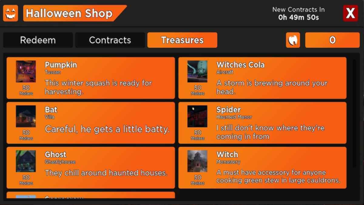 Para consultar el menú de Tesoros y ver qué tesoros aún tienes que recolectar, haz clic en el botón de Halloween en el menú principal. Esta pestaña también te informará cuáles son los tesoros y en qué mapas se encuentran. Si está buscando más máscaras y paquetes de locutores nuevos, asegúrese de consultar los últimos códigos del Arsenal para recargar.