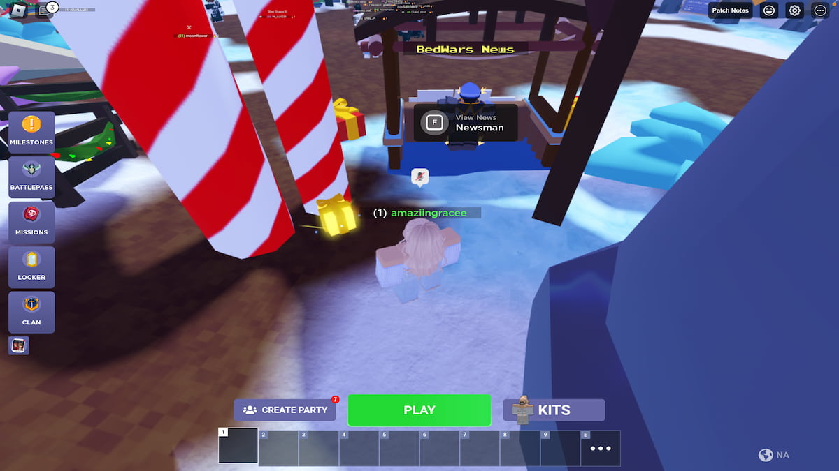 - Siguiendo el camino a la derecha de la cola del tren, encontrarás el stand de BedWars News. Detrás de este puesto hay un grupo de bastones de caramelo, y detrás de estos bastones de caramelo está el sexto regalo.