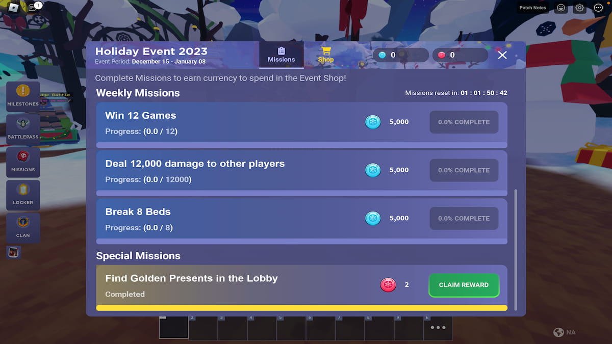Cuando se abra el menú, desplácese hacia abajo hasta que vea el Misiones especiales título. Aquí puedes reclamar tus dos monedas rojas por completar la misión Buscar regalos de oro en el lobby.