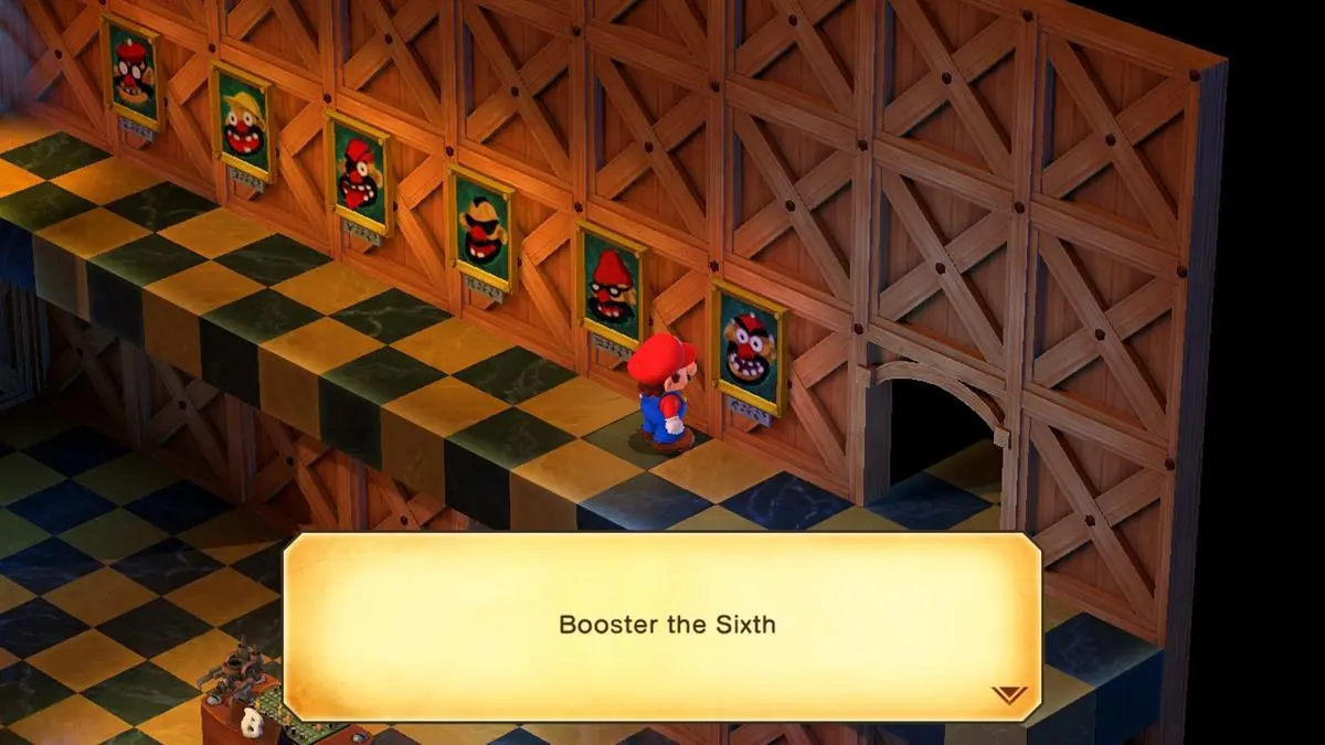 La pista para el rompecabezas de retratos de Booster Tower está en realidad en la primera habitación al ingresar a la mazmorra. Si subes las escaleras, verás las fotos de los miembros del clan Booster, ordenados desde el mayor (Booster the First) hasta el más joven (Booster the Sixth).