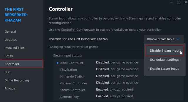 Jag har testat en Xbox Series-kontroller samt en standard DualShock 4 på den första Berserker: Khazan och båda fungerar perfekt som förväntat. Men eftersom dessa kontroller har inbyggda profiler konfigurerade av utvecklarna, kan Steams inträde förstöra saker och ting för PlayStation-kontroller. För att undvika detta måste du inaktivera ånginmatning specifikt för den första Berserker: Khazan.
