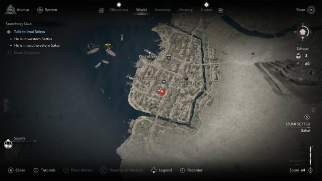 Använd din vänstra avtryckare eller L2 för att gå in i observationsläge. Du kommer att se blå och gula markörer runt Sakai. Jag föreslår att du tar alla gula markörer, eftersom de flesta av dessa är resurser för ditt gömställe. Den blå markören är för dina uppdrag, som i det här fallet skulle vara Imai Sokyu om du är nära honom.