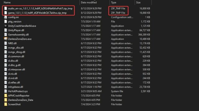 Ta bort de tillfälliga zip-filerna i mappen ZenlessZoneZeroGame. Dessa filer kommer att ha ”ZIP_TMP” förlängning. För att göra det enklare kan du sortera mappen efter ”ändringsdatum” för att enkelt identifiera nya.
