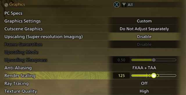 Om du har GPU-bandbredden kan du öka den interna upplösningen i Monster Hunter Wilds för att förbättra den övergripande bildkvaliteten. Eftersom Monster Hunter Wilds inte har korrekt DSR/DLDSR-stöd på PC, måste du lita på den här reglaget. Den är dock otillgänglig om du är skalinaktiverad.