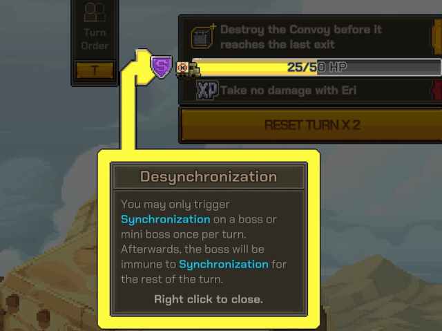 Bossar och minibossar kommer att utlösa dissync om de träffas av en synkrosattack under en sväng. Detta indikeras av en liten lila sköld till vänster om din hälsobar och förblir aktiv under hela din tur. Medan dissync är aktivt är chefer och minibossar immuna mot alla synkrosattacker och kommer inte att ta skada.