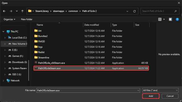 - Path of Exile 2’nin kurulu olduğu yere gidin ve PathOfExileSteam.exe Yaklaşık 65 MB boyutunda yürütülebilir dosya.