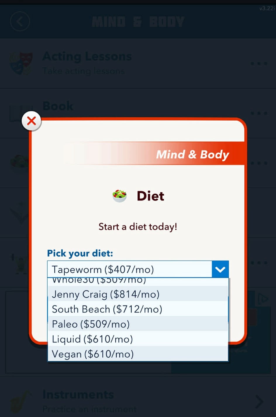 та виберіть опцію Дієта Потім перейдіть до випадаючого меню, щоб вибрати тип дієти, якої ви хочете дотримуватися. Усі вони коштують різну суму грошей, зазвичай від 400 до 900 доларів, тому вам знадобляться гроші, щоб виконати це завдання. Дієти в BitLife Сходіть у спортзал 10 разів у BitLife Далі ви повинні