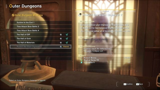 Наприклад, ви можете Пройти підземелля «Захисти гігантське Дігім’ясо».що вимагає від вас захисту від хвилі з приблизно 30 ворогів. Якщо у вашій групі є сильний Дігімон, ви все одно можете завдати ДігіТеку всім, що дасть їм легкий досвід для вашого слабшого Дігімона. На його виконання потрібно менше двох хвилин, тому це дивовижний спосіб підвищити свій талант, оскільки ці ДігіТеки зараховуються як знищення ворога.