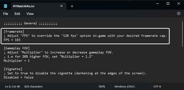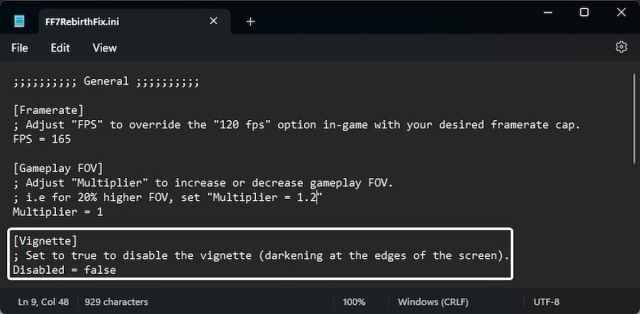 Ви завжди можете редагувати FF7RebirthFix.ini файл, щоб налаштувати ці ефекти та функції.