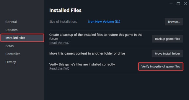 - Trong đó Các tập tin đã cài đặt tab, nhấp vào Xác minh tính toàn vẹn của tệp trò chơi