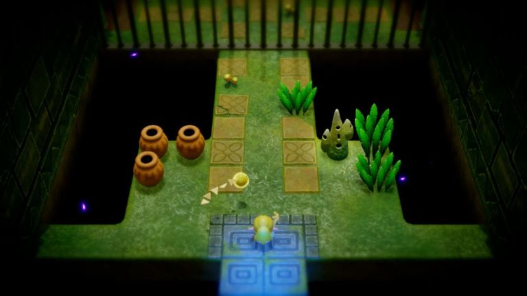Ve a la derecha y ata la segunda estatua para revelar una entrada. Utilice el Keese eléctrico eléctrico y apunta a los cristales verdes para activarlos y generar un cofre del tesoro con una llave pequeña. Regrese a la sala principal, tome la puerta suroeste y corte el césped para revelar otra puerta.
